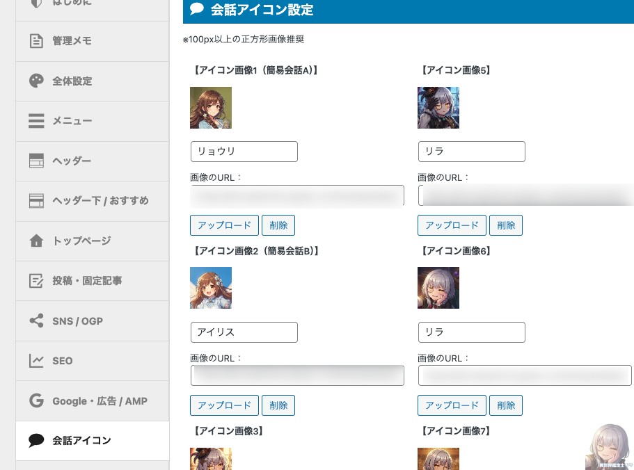 AFFINGER6なら、「AFFINGER管理」>「会話アイコン設定」で画像を登録するだけで、一瞬で呼び出せます。