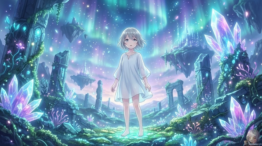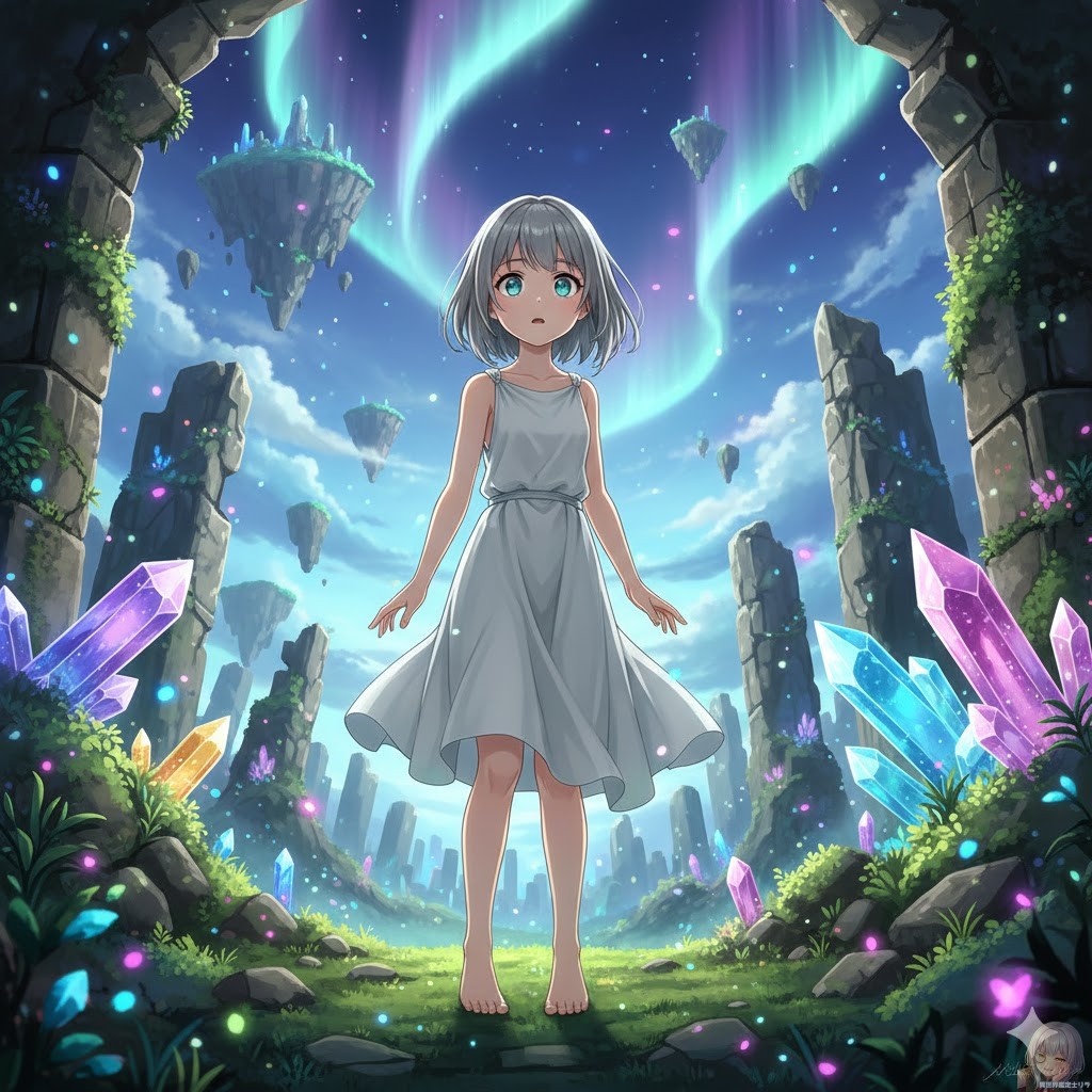 すっごい!見て見て、リラ店長! 背景にオーロラ! 空に浮かぶ島! そして巨大なクリスタル!! まさにファンタジーの主人公だよぉぉ! 10歳のリネアさん、裸足で『世界と対話』してる感じがして、めちゃくちゃ神秘的だよぉぉ!!